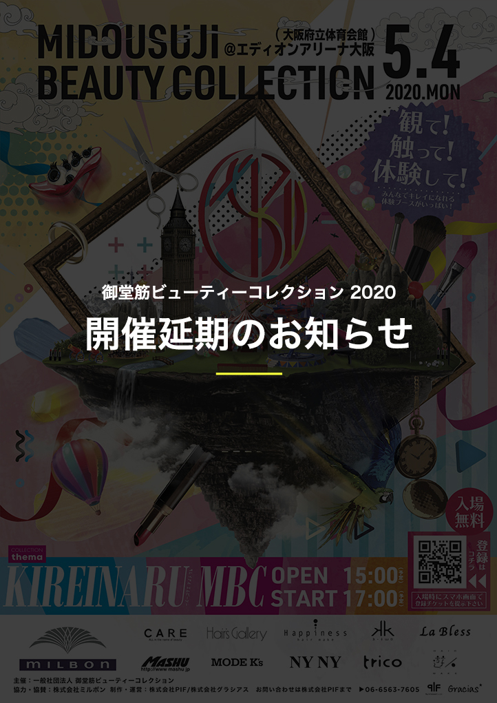 『御堂筋ビューティーコレクション 2020』につきまして、開催に向けて対策を講じ準備を進めてまいりましたが、新型コロナウイルスの感染拡大状況、政府および関係機関等からの注意喚起を踏まえ、検討を重ねました結果、ご来場になるお客様、出展者、出演者、並びにスタッフ・関係者の安全面を最優先し、開催を延期させて頂く事といたしました。